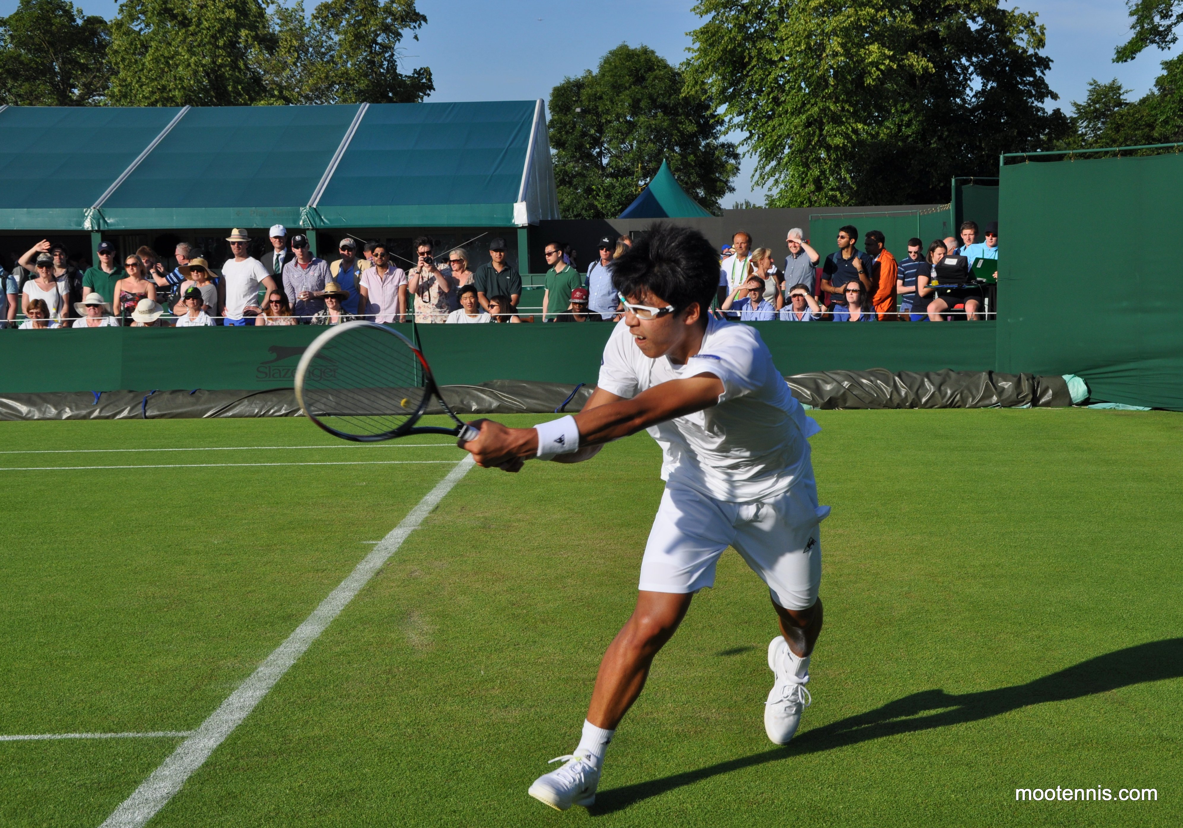 This photo of Hyeon Chung shows how close you can get to the players on the outside courts at Wimbledon.